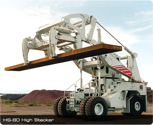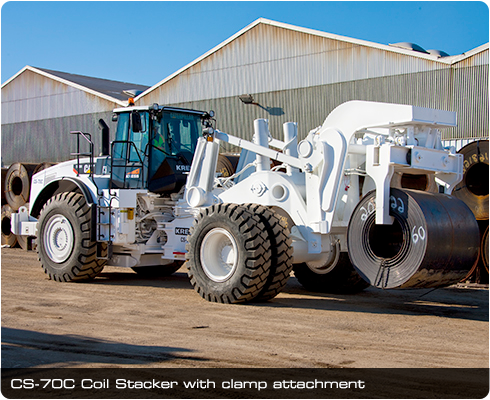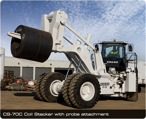 Kress “HS” series coil stackers are custom designed high capacity transport vehicles capable of handling product up to 35 short tons (32 metric tons). With certain attachments payload capacities of 45 short tons (40.8 metric tons) can be achieved. Narrow overall width and articulated steering allow exceptional maneuverability and access into confined areas.